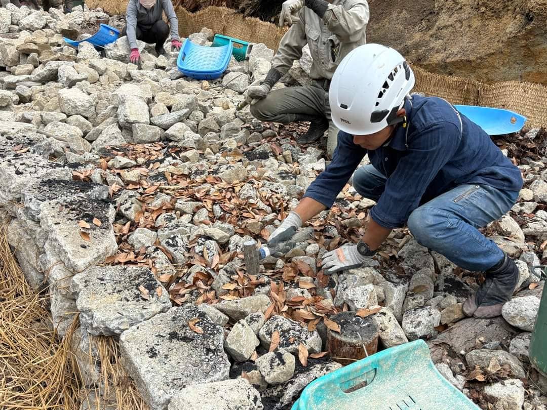 令和6年能登半島地震被災地、石川県七尾市での震災復興一期工事における有機土木施工。伝統工法に基づく有機土木。