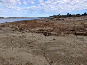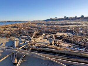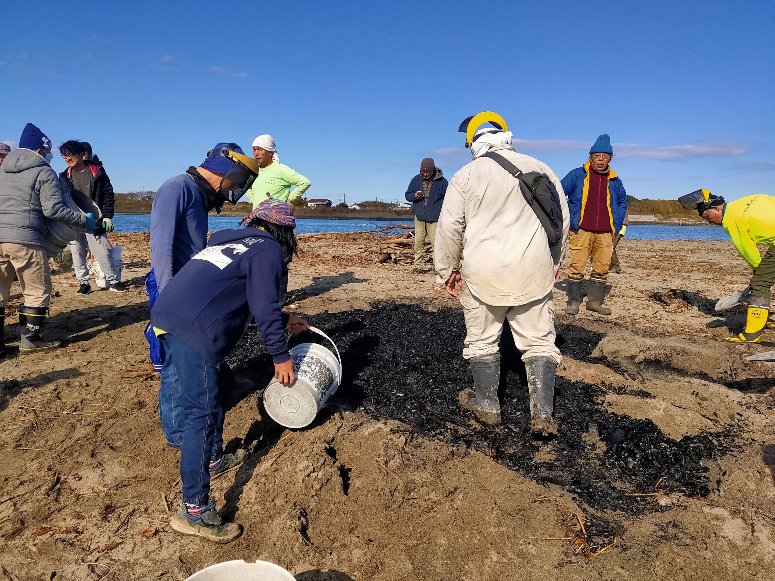 雲一つない青空のもと、新年最初の海岸活動は、ふた月の間に中洲へとたまった流竹を、竹炭資源へと生まれ変わらせました*