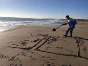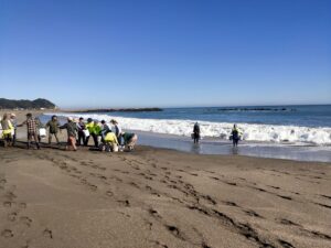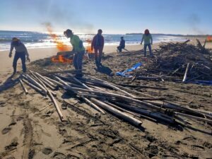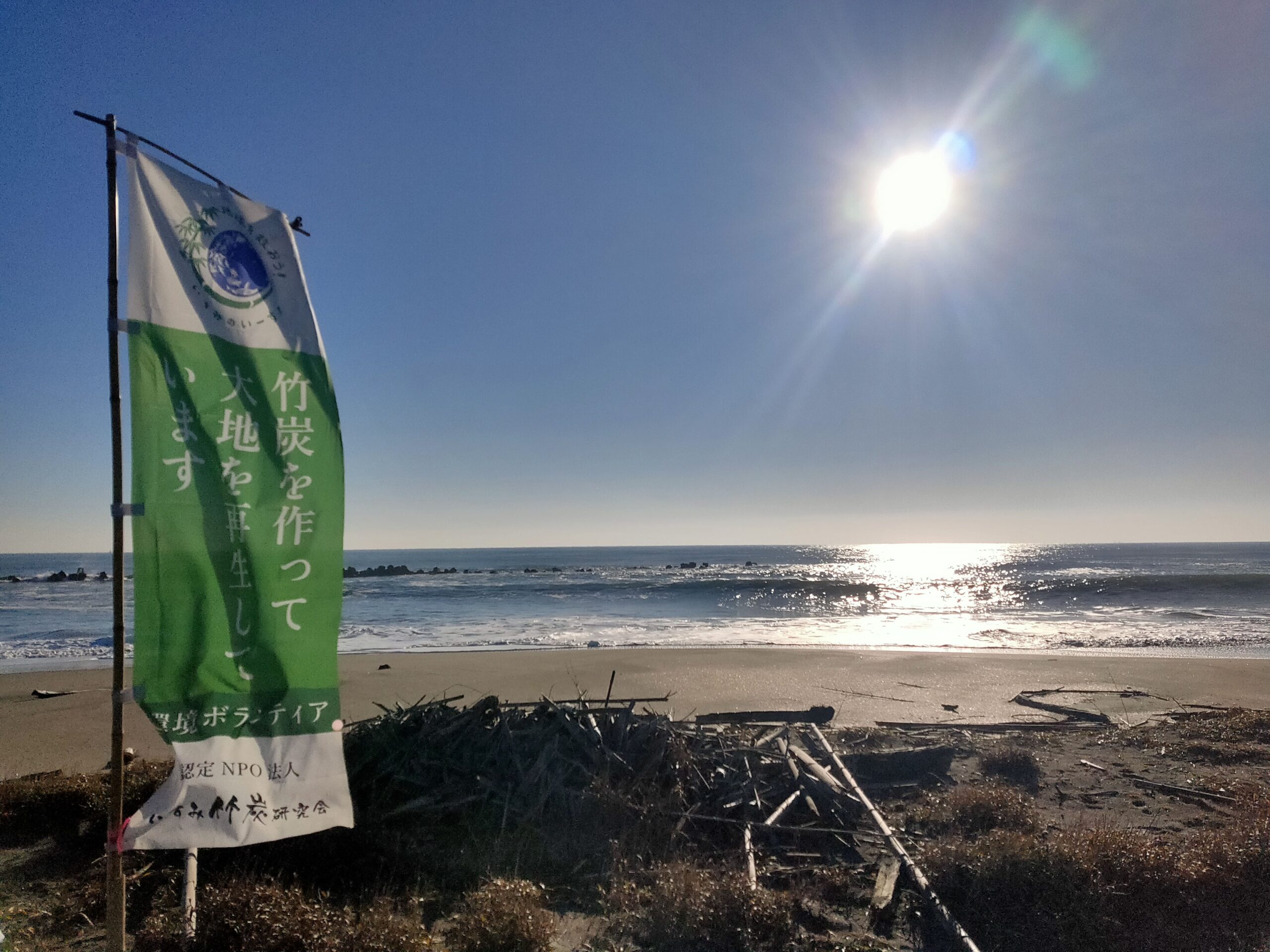 今年ラストの海岸活動は、きらめく晴天の外海(ソトウミ)で、サーファーさんが集めてくださった流竹を竹炭へと変えていきました。